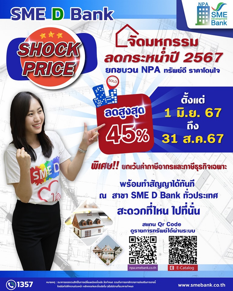 ธนาคารพัฒนาวิสาหกิจขนาดกลางและขนาดย่อมแห่งประเทศไทย จัดมหกรรม ยกขบวน NPA โดยมีดินเปล่า ที่ดินพร้อมสิ่งปลูกสร้าง อาคารโรงงาน เหมาะกับการประกอบธุรกิจ อาคารพาณิชย์หรือที่อยู่อาศัย ซึ่งเดินทางสะดวก สาธารณูปโภคเข้าถึง คุ้มค่าต่อการลงทุน สามารถต่อยอดสร้างรายได้ ขยายกิจการเติบโต ลดสูงสุด 45% ตั้งแต่บัดนี้ – 31 สิงหาคม 2567 พิเศษ ยกเว้นค่าภาษีอากรและภาษีธุรกิจเฉพาะ พร้อมทำสัญญาได้ทันที ณ สาขา SME D Bank ทั่วประเทศ สามารถสแกน QR Code ดูรายการทรัพย์ได้ผ่านโปสเตอร์ประชาสัมพันธ์ สอบถามข้อมูลได้ที่ Call center 1357