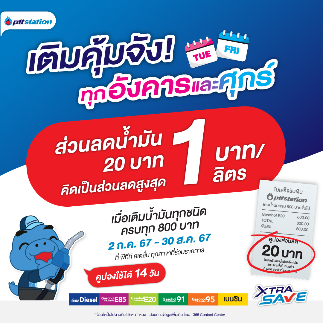 พีทีที สเตชั่น ขยายเวลาเติมสุขคืนความสุขให้ผู้บริโภคได้เติมน้ำมันแบบคุ้มจัดหนัก จัดเต็ม แถมเซฟเงินในกระเป๋า ด้วยคูปองส่วนลดมูลค่า 20 บาทท้ายใบเสร็จน้ำมัน*