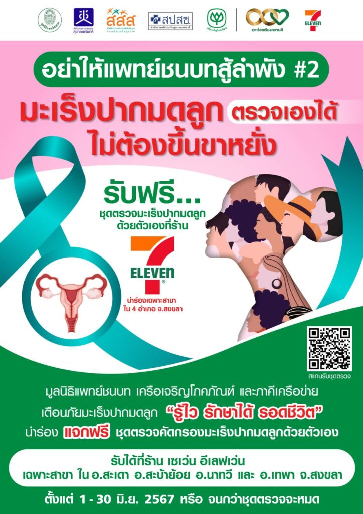 ปัจจุบันมะเร็งปากมดลูกเป็นโรคมะเร็งที่พบมากเป็นอันดับ 2 ของโรคมะเร็งทั้งหมดของหญิงไทยรองจากมะเร็งเต้านม แต่มีอัตราการเสียชีวิตมากเป็นอันดับ 1 ในกลุ่มที่มีอายุช่วง 40 ปีขึ้นไป ซึ่งในแต่ละปีจะพบผู้ป่วยมะเร็งฯ รายใหม่ประมาณ 10,000 ราย และเสียชีวิตจากการเป็นมะเร็งปากมดลูก 5,216 รายหรือ 14 คนต่อวัน โดยคาดการณ์ว่าในปี 2568 จะมีผู้ป่วยมะเร็งปากมดลูกสูงขึ้นเป็น 13,082 คน เสียชีวิตเพิ่ม 7,871 คน หรือ 21 คนต่อวัน หากไม่มีการตรวจคัดกรองมะเร็งเบื้องต้นที่เหมาะสมและทันท่วงที มูลนิธิแพทย์ชนบท จึงร่วมกับเครือเจริญโภคภัณฑ์ (ซีพี) บมจ.ซีพีออลล์ สำนักงานคณะกรรมการสุขภาพแห่งชาติ (สช.) สำนักงานกองทุนสนับสนุนการสร้างเสริมสุขภาพ (สสส.) และสำนักงานหลักประกันสุขภาพแห่งชาติ (สปสช.) รณรงค์เตือนภัยให้หญิงไทยตระหนักและเห็นถึงความสำคัญของการตรวจคัดกรองมะเร็งปากมดลูกภายใต้แนวคิด “รู้ไว รักษาได้ รอดชีวิต” นำร่องแจกฟรี ชุดตรวจคัดกรองมะเร็งปากมดลูกด้วยตัวเอง HPV Self Test รวม 12,000 ชุด สามารถลงทะเบียนรับสิทธิในแอปพลิเคชันเป๋าตังและมารับได้ที่เซเว่น อีเลฟเว่นเฉพาะใน 4 อำเภอ จ.สงขลา ได้แก่ อำเภอสะเดา อำเภอสะบ้าย้อย อำเภอนาทวีและ อำเภอเทพา ตั้งแต่วันที่ 1-30 มิถุนายน 2567 หรือ จนกว่าชุดตรวจจะหมด