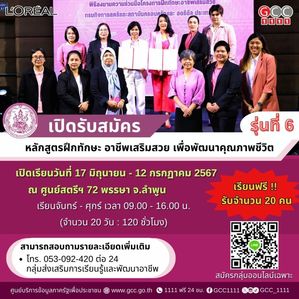 - โดยความร่วมมือระหว่าง บริษัท ลอรีอัล (ประเทศไทย) จำกัด กับ กรมกิจการสตรีและสถาบันครอบครัว กระทรวงพัฒนาสังคมและความมั่นคงของมนุษย์ เรียน (ฟรี)….มีอาชีพ ได้ที่ ศูนย์สตรีฯ 72 พรรษา ลำพูน