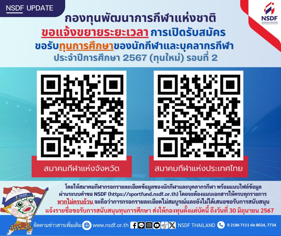 กองทุนพัฒนาการกีฬาแห่งชาติ การกีฬาแห่งประเทศไทย แจ้งขยายระยะเวลาเปิดรับสมัครขอรับทุนการศึกษา ประจำปีการศึกษา 2567 (ทุนใหม่) รอบที่ 2