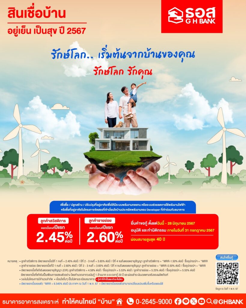 ธอส. แนะนำสินเชื่อบ้าน อยู่เย็น เป็นสุข ปี 2567 รักษ์โลก ตั้งแต่บัดนี้ – 28 มิ.ย. 67
