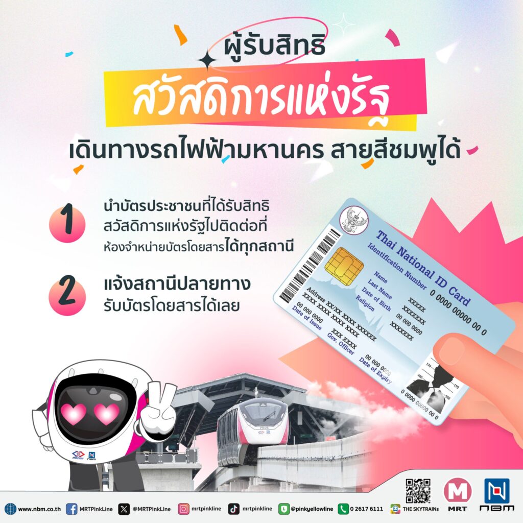 รถไฟฟ้ามหานคร สายสีชมพู ชี้แจงผู้รับสิทธิสวัสดิการแห่งรัฐ ใช้สิทธิผ่านบัตรประชาชน เดินทางรถไฟฟ้ามหานคร สายสีชมพูได้