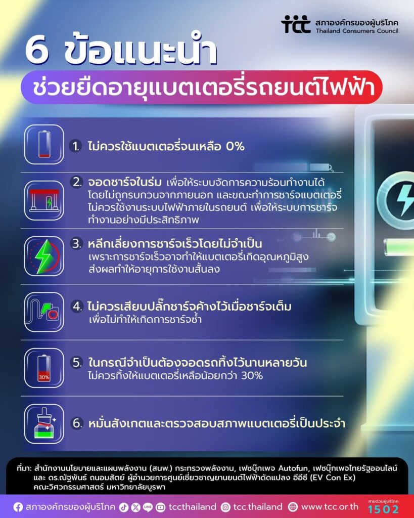 สภาองค์กรของผู้บริโภค แนะนำแบตเตอรี่ของรถยนต์ไฟฟ้าเป็นส่วนประกอบสำคัญของรถยนต์ไฟฟ้า (Electric Vehicle : EV Car) เพื่อรักษาประสิทธิภาพและอายุการใช้งานของแบตเตอรี่ไว้ให้ยาวนาน