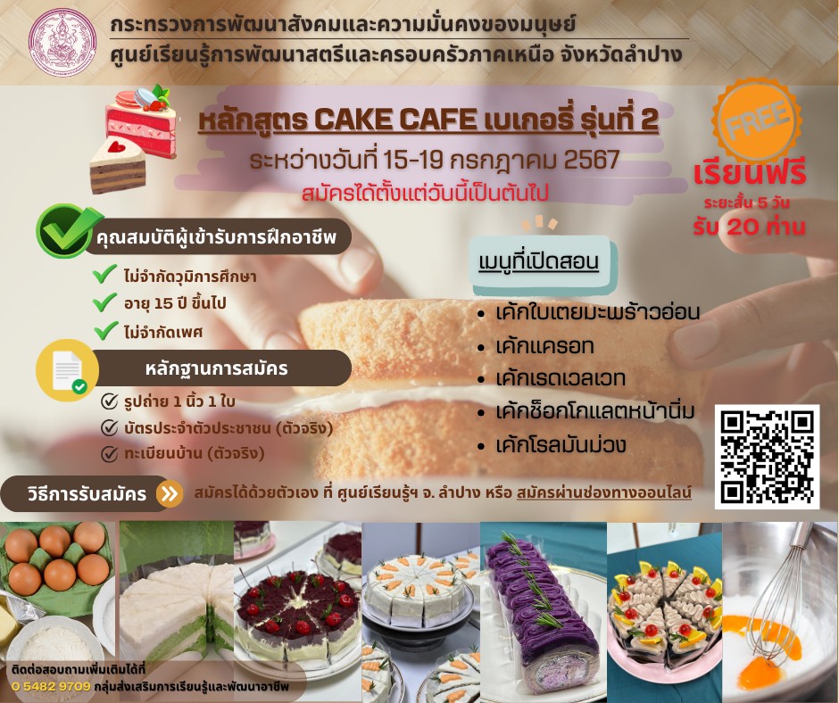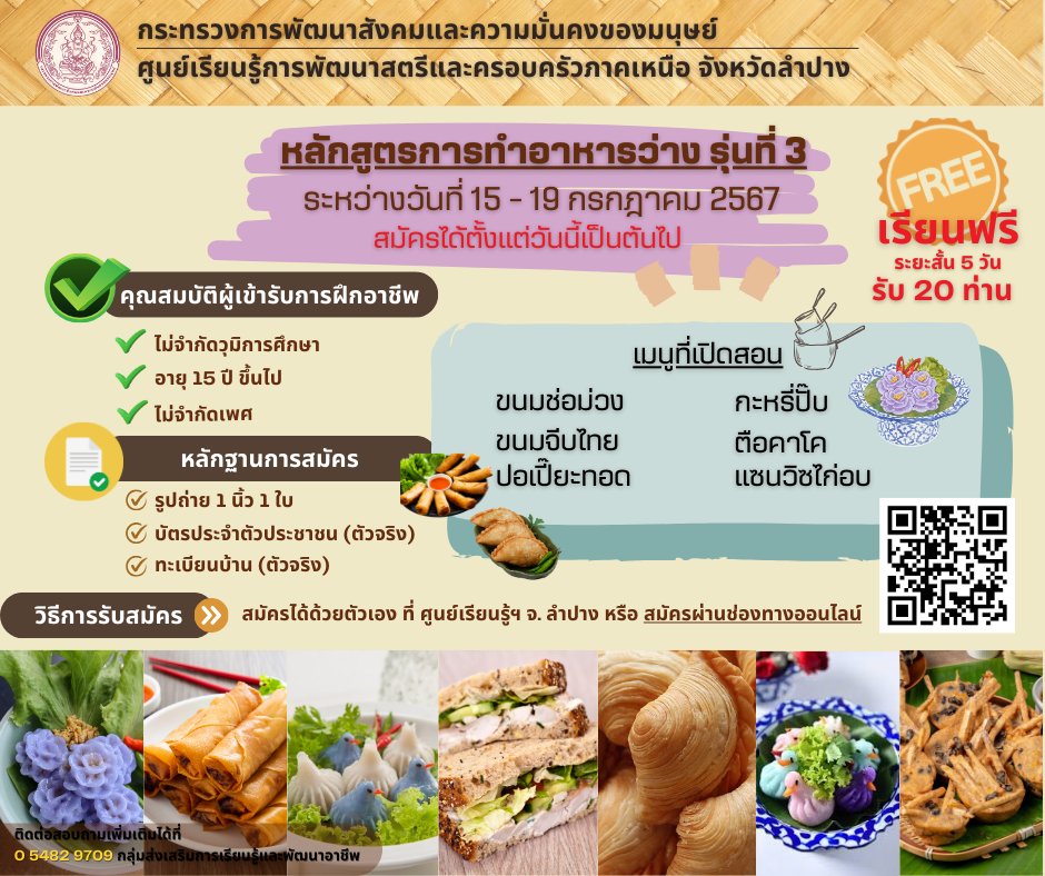 กรมกิจการสตรีและสถาบันครอบครัว โดยศูนย์เรียนรู้การพัฒนาสตรีและครอบครัว จังหวัดลำปาง เปิดรับสมัครฝึกอาชีพหลักสูตรตามความสนใจ 6 หลักสูตร