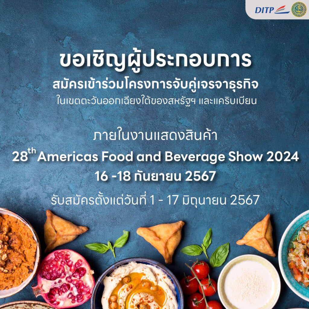 กรมส่งเสริมการค้าระหว่างประเทศ ขอเชิญผู้ประกอบการอาหารและบรรจุภัณฑ์อาหารที่สนใจไปเจาะตลาดสหรัฐอเมริกา เข้าร่วมโครงการจับคู่เจรจาธุรกิจในเขตตะวันออกเฉียงใต้ของสหรัฐฯ และแคริบเบียน ภายในงานแสดงสินค้า 28th Americas Food and Beverage Show 2024 ระหว่างวันที่ 16 – 18 กันยายน 2567 ณ เมืองไมอามี มลรัฐฟลอริดา ประเทศสหรัฐอเมริกา