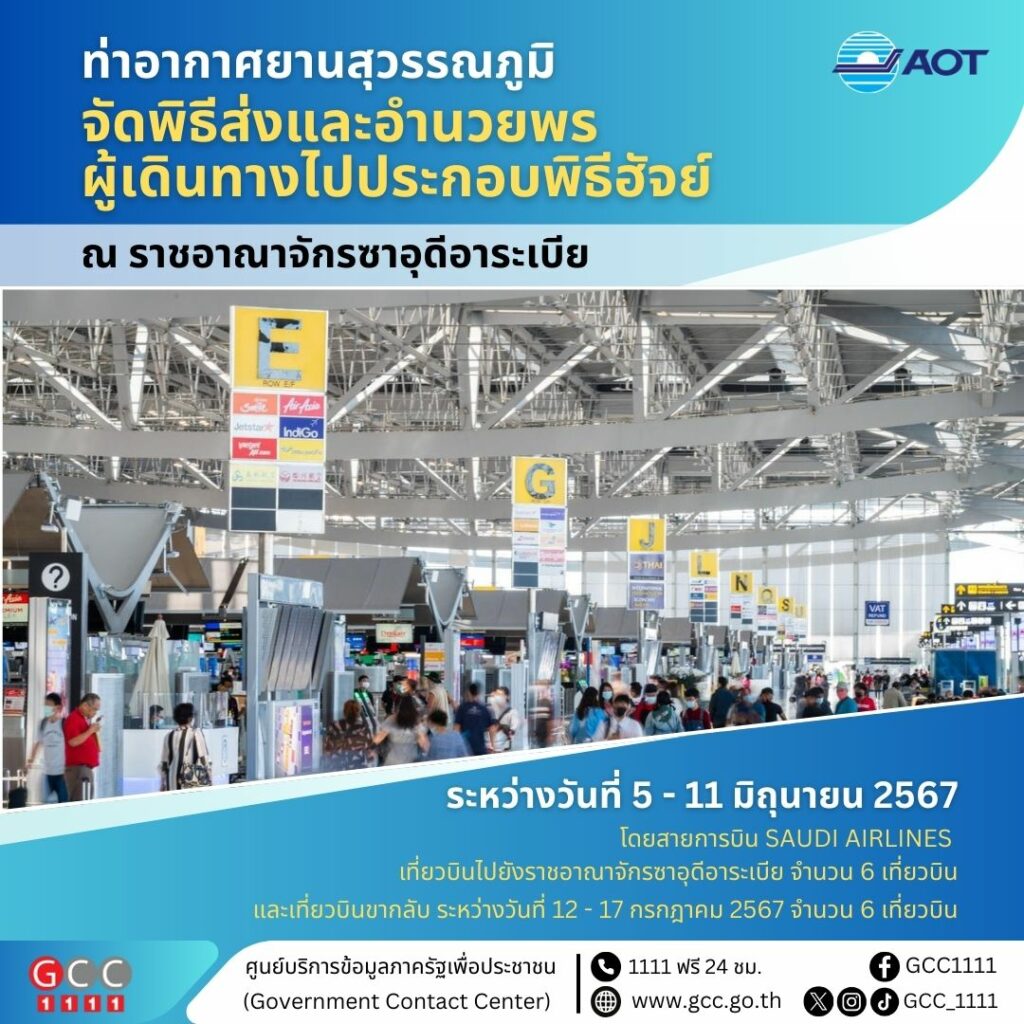 ท่าอากาศยานสุวรรณภูมิพร้อมอำนวยความสะดวกผู้เดินทางไปแสวงบุญประกอบพิธีฮัจย์ ประจำปี 2567 ซึ่งในปีนี้คาดว่าจะมีผู้เดินทางประมาณ 2,200 คน