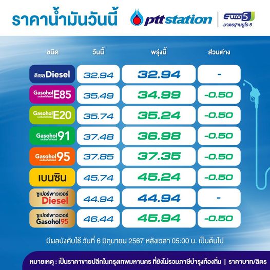 บริษัท ปตท. จำกัด (มหาชน) ปรับลดราคาน้ำมันในกลุ่มเบนซิน โดยน้ำมันในกลุ่มเบนซิน ปรับลดราคา 0.50 บาท/ลิตร ส่วนน้ำมันในกลุ่มดีเซลราคาคงเดิม มีผลวันที่ 6 มิถุนายน 2567 หลังเวลา 05.00 น. เป็นต้นไป ราคาที่ประกาศเป็นราคาขายปลีกในกรุงเทพมหานคร ที่ยังไม่รวมภาษีบำรุงท้องถิ่น