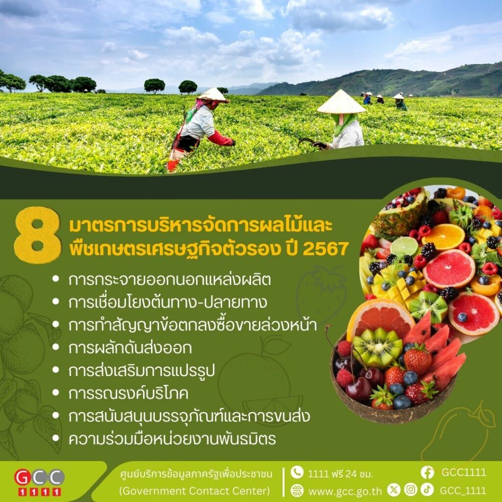 รัฐบาล เห็นชอบมาตรการบริหารจัดการผลไม้และพืชเกษตรเศรษฐกิจตัวรอง ผ่าน 8 กลไกหลัก  โดยภาครัฐและภาคเอกชนได้ร่วมมือในการบริหารจัดการ ตั้งแต่ช่วงผลผลิตออกจนผลผลิตสู่ตลาดเข้าไปช่วยแก้ไขปัญหาล้นตลาด หาทางช่วยระบายผลผลิตผ่านมาตรการต่าง ๆ เพื่อช่วยเหลือให้เกษตรกรอยู่ได้ และมีรายได้เพิ่มขึ้น