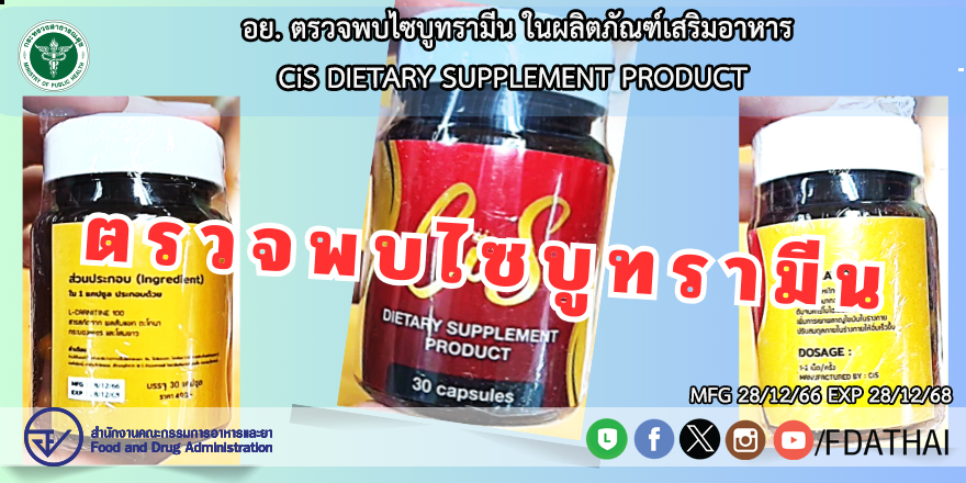สำนักงานคณะกรรมการอาหารและยา ตรวจพบ ไซบูทรามีน ใผลิตภัณฑ์เสริมอาหาร CiS DIETARY SUPPLEMENT PRODUCT MFG มีผลกระทบต่อระบบหัวใจและหลอดเลือด ทำให้เกิดผลเสียร้ายแรงจนถึงแก่ชีวิต จัดเป็นวัตถุที่ออกฤทธิ์ต่อจิตและประสาท จึงขอประกาศให้ประชาชนระมัดระวังในการซื้อหรือบริโภคผลิตภัณฑ์อาหารดังกล่าว ทั้งนี้ อย. และหน่วยงานที่เกี่ยวข้องอยู่ระหว่างดำเนินการตามกฎหมายกับผู้กระทำผิด