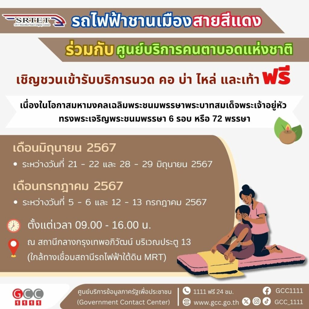 รถไฟฟ้าชานเมืองสาย สีแดง ร่วมกับ ศูนย์บริการคนตาบอดแห่งชาติ เชิญชวนเข้ารับบริการนวด คอ บ่า ไหล่ และเท้า โดยไม่มีค่าใช้จ่าย ณ สถานีกลางกรุงเทพอภิวัฒน์ บริเวณประตู 13 (ใกล้ทางเชื่อมสถานีรถไฟฟ้าใต้ดิน MRT) ระหว่างวันที่ 21 – 22 และ 28 – 29 มิถุนายน 2567 และวันที่ 5 – 6 และ 12 – 13 กรกฎาคม 2567 เวลา 09.00 – 16.00 น. สอบถามเพิ่มเติมได้ที่ Call Center 1690 ตลอด 24 ชั่วโมง