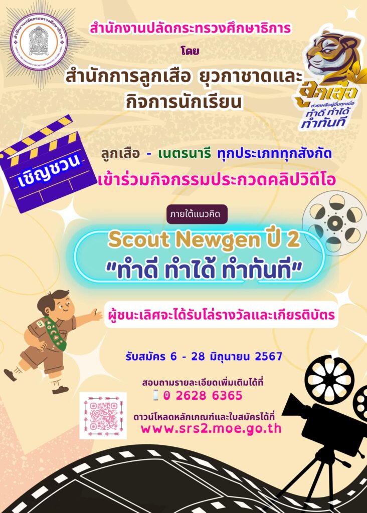 กระทรวงศึกษาธิการ โดย สำนักการลูกเสือ ยุวกาชาดและกิจการนักเรียน เชิญชวนสมัครเข้าร่วมการประกวดสื่อสร้างสรรค์ Scout Newgen ปีที่ 2 ตั้งแต่บัดนี้ – 28 มิถุนายน 2567