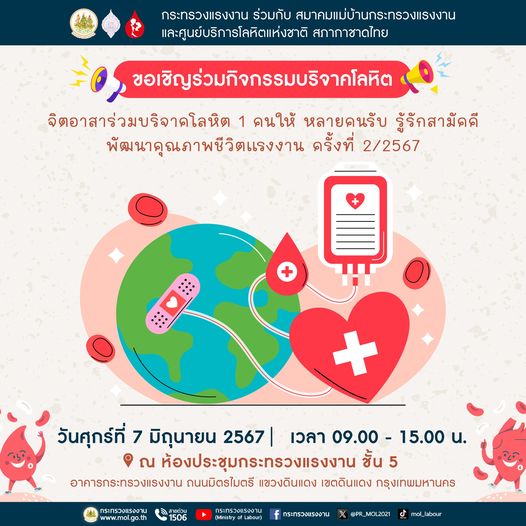 กระทรวงแรงงาน ขอเชิญร่วมบริจาคโลหิต ในวันศุกร์ที่ 7 มิถุนายน 2567
