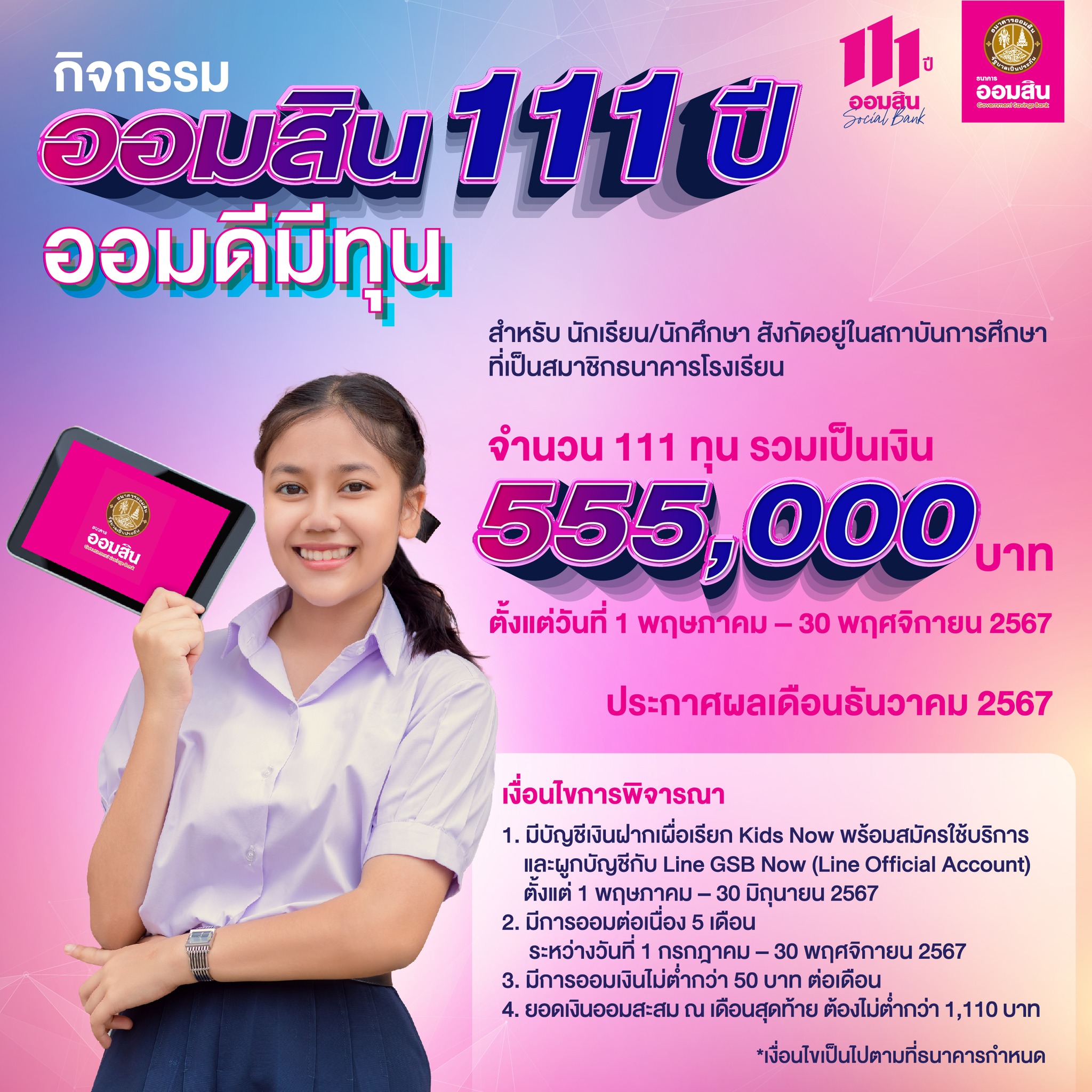 ธนาคารออมสิน ชวนร่วม “กิจกรรมออมสิน 111 ปี ออมดีมีทุน” สำหรับ นักเรียน/นักศึกษา สังกัดอยู่ในสถาบันการศึกษาที่เป็นสมาชิกธนาคารโรงเรียน ชิงทุนการศึกษา จำนวน 111 ทุน รวมเป็นเงิน 555,000 บาท ระยะเวลากิจกรรมวันที่ 1 พฤษภาคม – 30 พฤศจิกายน 2567 ประกาศผลภายในเดือนธันวาคม 2567 เนื่องในวาระครบรอบวันคล้ายวันสถาปนาธนาคารออมสิน ครบ 111 ปี