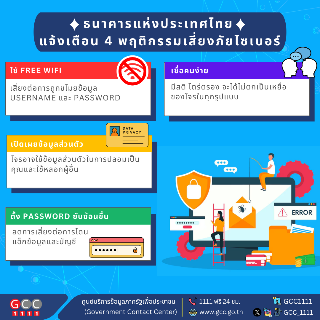 ธนาคารแห่งประเทศไทย แจ้งเตือน 4 พฤติกรรมเสี่ยงภัยไซเบอร์ พอกันทีกับการตกเป็นเหยื่อภัยไซเบอร์ วันนี้เรามี 4 พฤติกรรมเสี่ยงที่ควรต้องหลีกเลี่ยงเพื่อไม่ให้ตกเป็นเหยื่ออีกต่อไป