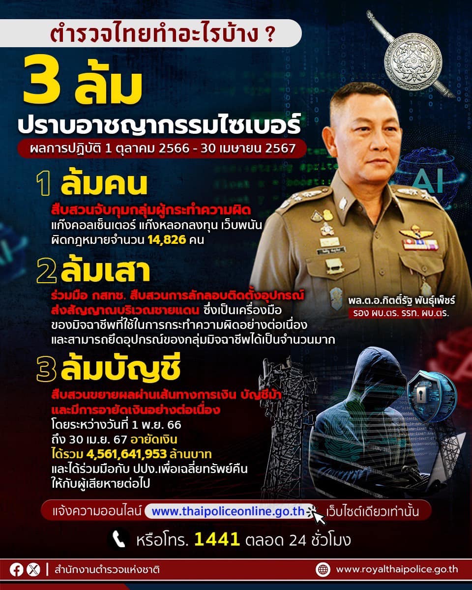 สำนักงานตำรวจแห่งชาติ ดำเนินการมุ่งมั่นคุ้มครองประชาชนจากภัยอาชญากรรมไซเบอร์ “ล้มคน-ล้มเสา-ล้มบัญชี”