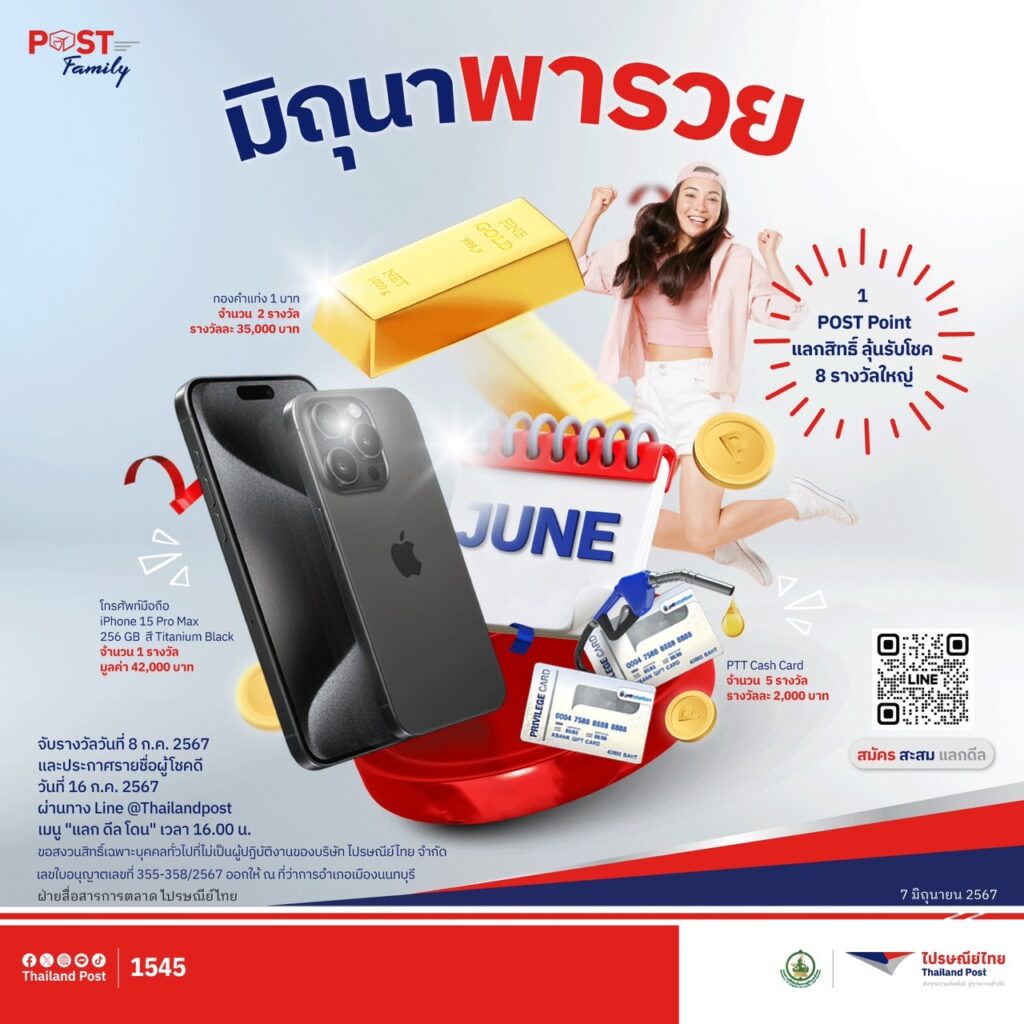 บริษัท ไปรษณีย์ไทย จำกัด ขอเชิญร่วมกิจกรรม 1 คะแนน POST Family ลุ้นรับโชค 8 รางวัลใหญ่ ตั้งแต่บัดนี้ – สิงหาคม 2567 จับรางวัลวันที่ 8 กรกฎาคม 2567 ประกาศรายชื่อผู้โชคดีวันที่ 16 กรกฎาคม 2567 ทาง line @Thailandpost เมนู “แลก ดีล โดน” เวลา 16.00 น.