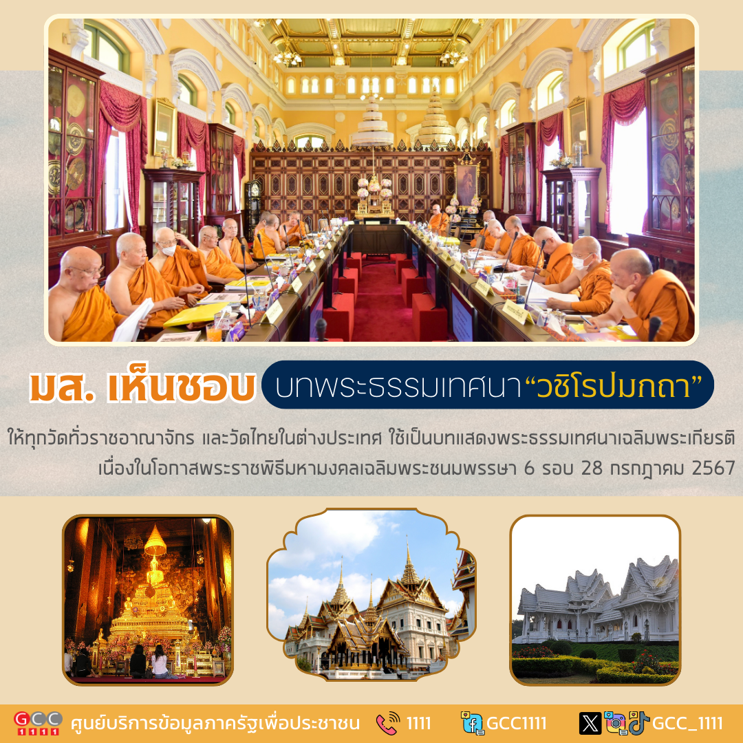 มส. เห็นชอบบทพระธรรมเทศนา “วชิโรปมกถา” ให้ทุกวัดทั่วราชอาณาจักร และวัดไทยในต่างประเทศ ใช้เป็นบทแสดงพระธรรมเทศนาเฉลิมพระเกียรติ เนื่องในโอกาสพระราชพิธีมหามงคลเฉลิมพระชนมพรรษา 6 รอบ 28 กรกฎาคม 2567