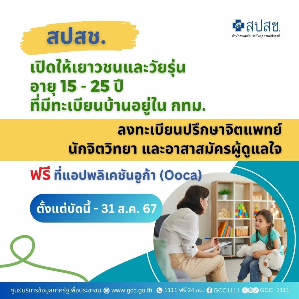 สำนักงานหลักประกันสุขภาพแห่งชาติ ร่วมกับแอปพลิเคชันอูก้า (Ooca) และสถาบันสุขภาพจิตเด็กและวัยรุ่นราชนครินทร์ เพื่อให้เยาวชนในกรุงเทพมหานคร ได้เข้าถึงบริการด้านสุขภาพจิต ผ่านโครงการ “ที่พักใจให้เยาวชน” เปิดให้เยาวชนและวัยรุ่นอายุ 15 – 25 ปี ที่มีทะเบียนบ้านอยู่ในกรุงเทพมหานคร ลงทะเบียนใช้บริการปรึกษาจิตแพทย นักจิตวิทยาและอาสาสมัครผู้ดูแลใจ โดยไม่เสียค่าใช้จ่าย ได้ที่แอปพลิเคชันอูก้า (Ooca) ตั้งแต่บัดนี้ – 31 สิงหาคม 2567