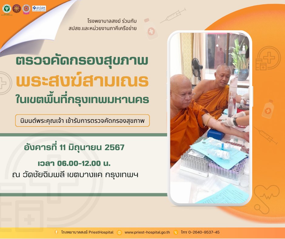 โรงพยาบาลสงฆ์ร่วม กับ สำนักงานหลักประกันสุขภาพแห่งชาติ และหน่วยงานภาคีเครือข่าย ออกให้บริการตรวจคัดกรองสุขภาพพระสงฆ์สามเณรในเขตพื้นที่กรุงเทพมหานคร ในวันที่ 11 มิถุนายน 2567 ตั้งแต่เวลา 06.00 – 12.00 น. ณ วัดชัยฉิมพลี เขตบางแค กรุงเทพฯ โดยขอให้พระสงฆ์งดน้ำและอาหารหลังเที่ยงคืน เพื่อเจาะเลือดตรวจหาค่าน้ำตาล ค่าไขมัน ค่ามะเร็งต่อมลูกหมาก และการตรวจคัดกรองอื่นๆ อาทิ โรคในผู้สูงอายุ การตรวจวัดดัชนีมวลกาย ตรวจการได้ยิน จักษุ ทันตกรรม การเอกซเรย์ปอด ตรวจคลื่นหัวใจไฟฟ้า การถวายความรู้ด้านโภชนาการ คลินิกโรคอ้วน คลินิกเลิกบุหรี่ และการบริหารขันธ์
