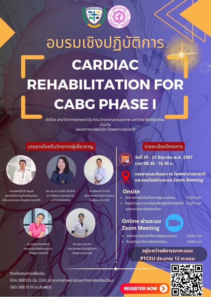โรงพยาบาลราชวิถี ขอเชิญนักกายภาพบำบัด และผู้สนใจร่วมอบรมโครงการ เรื่อง “Cardiac Rehabilitation for CABG phase I” วันที่ 20 – 21 มิถุนายน 2567 เวลา 08.30 – 16.30 น. ณ โรงพยาบาลราชวิถี และออนไลน์ : ถ่ายทอดสดผ่านระบบ Zoom meeting