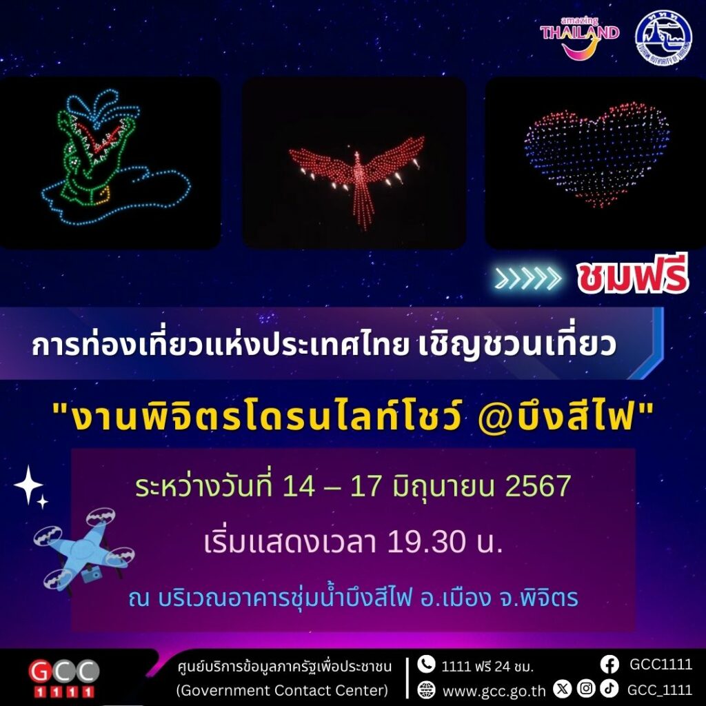 การท่องเที่ยวแห่งประเทศไทย เชิญชวนเที่ยว”งานพิจิตรโดรนไลท์โชว์ @บึงสีไฟ” ระหว่างวันที่ 14 – 17 มิถุนายน 2567 ณ บริเวณอาคารชุ่มน้ำบึงสีไฟ ชมฟรีทุกวัน