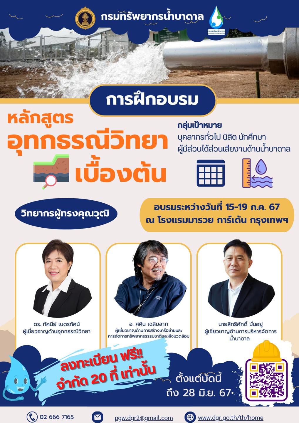 กรมทรัพยากรน้ำบาดาล จัดอบรมหลักสูตร “อุทกธรณีวิทยาเบื้องต้น” ระหว่างวันที่ 15 – 19 กรกฎาคม 2567 เวลา 09.00 – 16.30 น. ณ โรงแรมมารวย การ์เด้น กรุงเทพมหานคร โดยไม่มีค่าใช้จ่าย จำกัดเพียง 20 ที่นั่ง ผู้ที่สนใจสามารถลงทะเบียนได้ที่ QR Code หรือ https://shorturl.asia/UTHJX