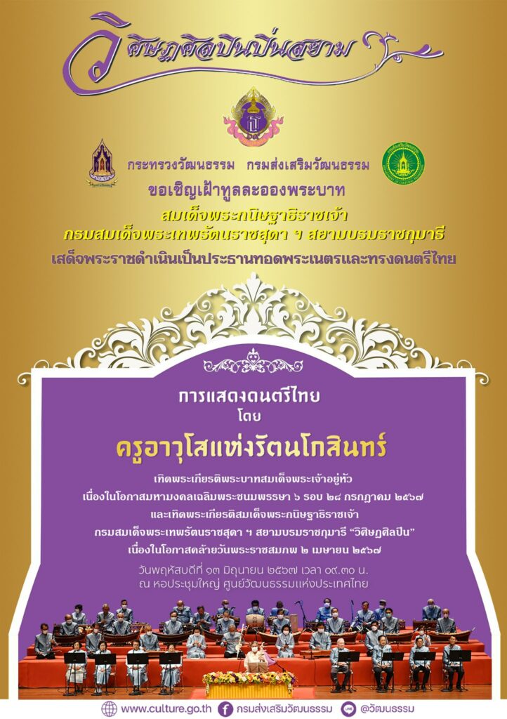 สวธ. ขอเชิญเฝ้าทูลละอองพระบาท สมเด็จพระกนิษฐาธิราชเจ้า กรมสมเด็จพระเทพรัตนราชสุดา ฯ สยามบรมราชกุมารี เสด็จพระราชดำเนินเป็นประธานทอดพระเนตรและทรงดนตรีไทย