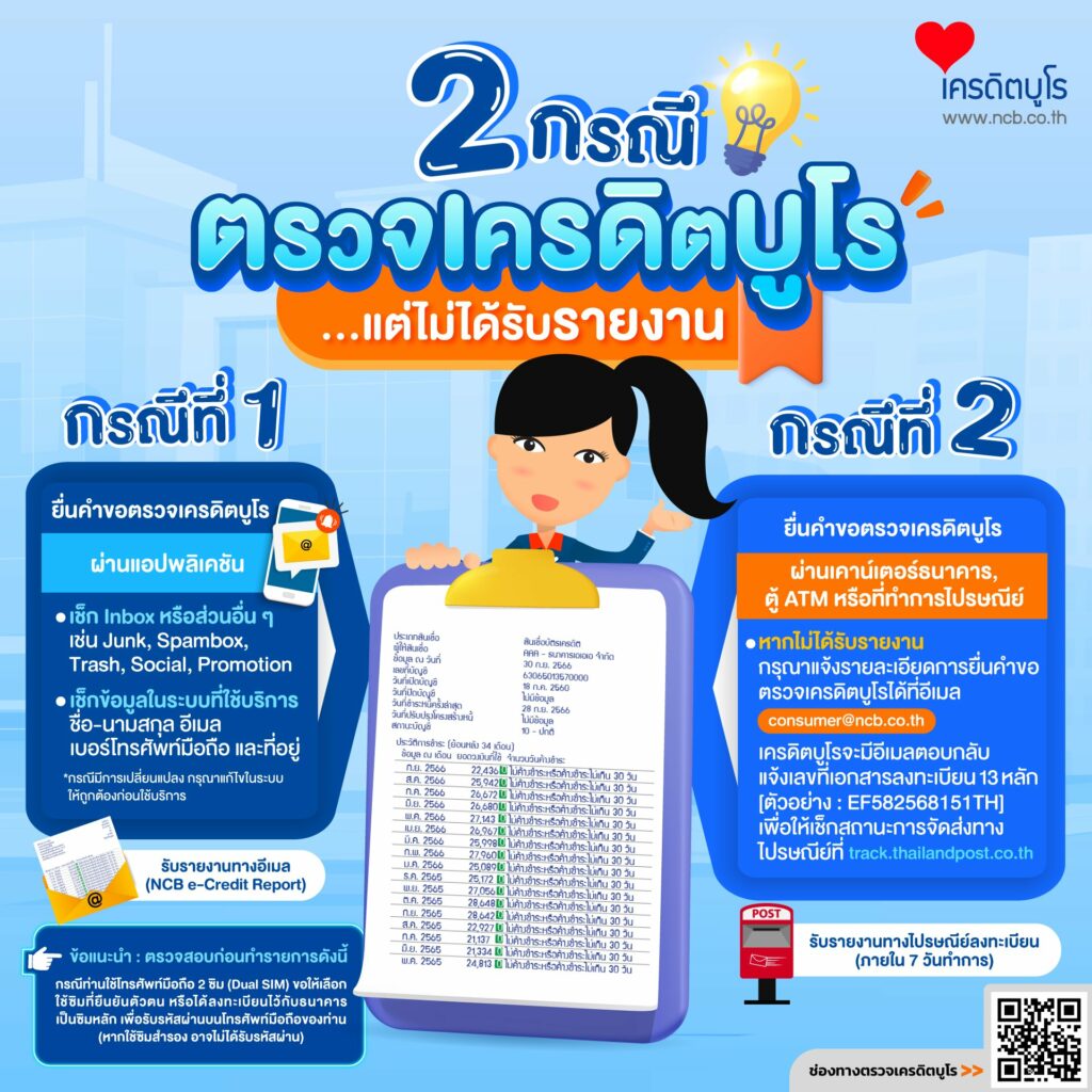 - หากไม่ได้รับรายงาน กรุณาแจ้งรายละเอียดการยื่นคำขอตรวจเครดิตบูโรได้ที่อีเมล consumer@ncb.co.th