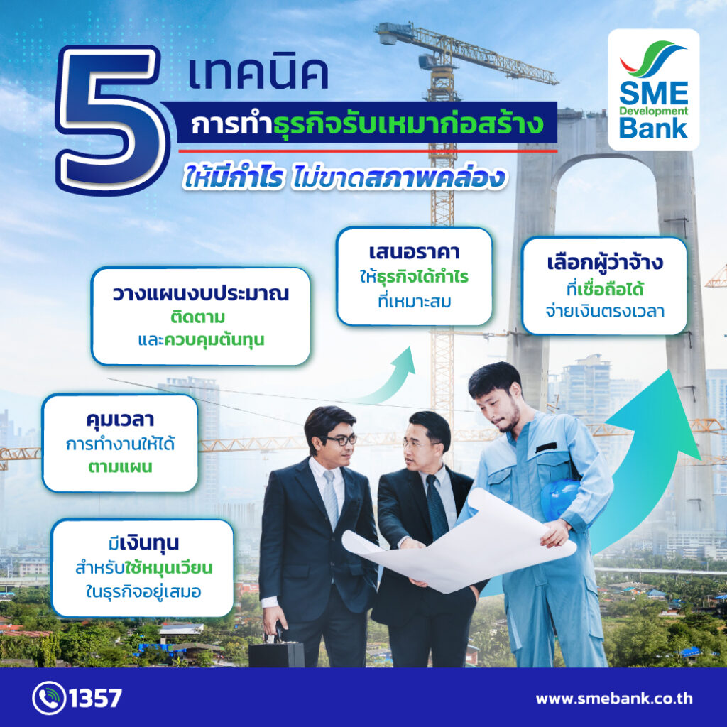 ธนาคารพัฒนาวิสาหกิจขนาดกลางและขนาดย่อมแห่งประเทศไทย ขอแนะนำ 5 เคล็ดลับทำกำไรให้กับ “ธุรกิจรับเหมาก่อสร้าง” เพื่อนำไปปรับใช้กับธุรกิจ ตอบความต้องการของตลาดได้อย่างตรงจุด และให้ธุรกิจรับเหมาก้าวไปข้างหน้าได้อย่างมั่นคงและยั่งยืน