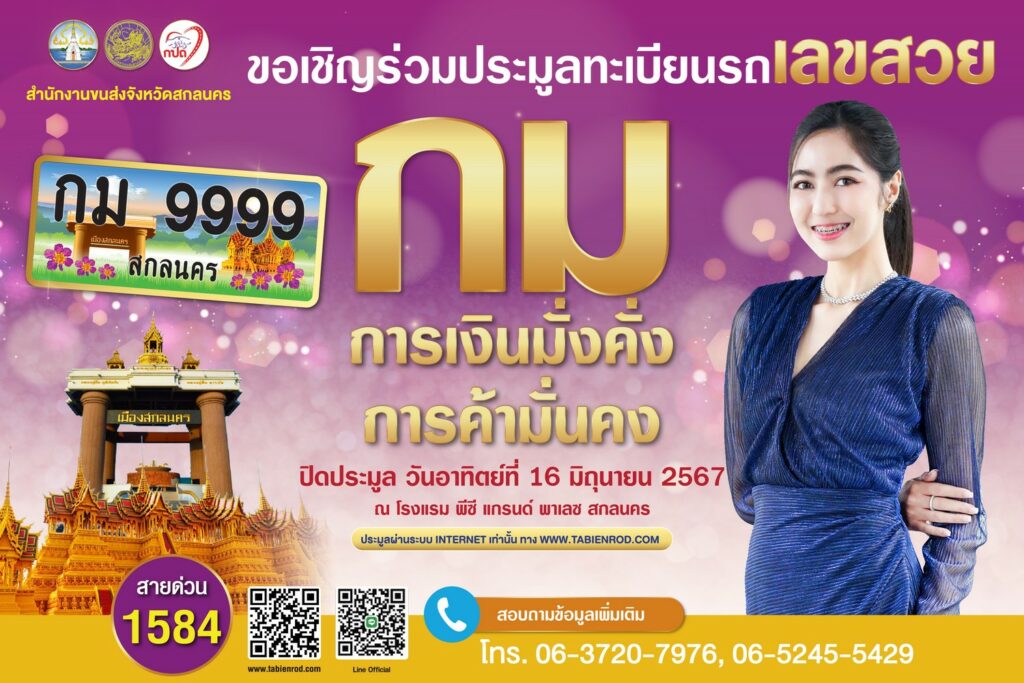 กปถ.สำนักงานขนส่งจังหวัดสกลนคร จัดงานประมูลทะเบียนรถ หมวดอักษร กม ในวันที่ 16 มิถุนายน 2567