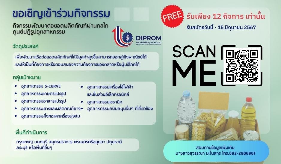 กรมส่งเสริมอุตสาหกรรม เชิญชวนผู้ประกอบการสมัครเข้าร่วมกิจกรรมพัฒนาต่อยอดผลิตภัณฑ์ผ่านกลไกศูนย์ปฏิรูปอุตสาหกรรม ข่าวสารกิจกรรม กรมส่งเสริมอุตสาหกรรม เชิญชวนผู้ประกอบการสมัครเข้าร่วมกิจกรรมพัฒนาต่อยอดผลิตภัณฑ์ผ่านกลไกศูนย์ปฏิรูปอุตสาหกรรม กรมส่งเสริมอุตสาหกรรม เชิญชวนผู้ประกอบการในพื้นที่กรุงเทพฯ นนทบุรี ปทุมธานี อยุธยา สระบุรี สมุทรปราการ ที่ต้องการเพิ่มมูลค่าผลิตภัณฑ์ สมัครเข้าร่วมกิจกรรมพัฒนาต่อยอดผลิตภัณฑ์ผ่านกลไกศูนย์ปฏิรูปอุตสาหกรรม เปิดรับสมัคร ตั้งแต่บัดนี้ – 15 มิถุนายน 2567 สมัครได้ที่ https://forms.gle/C1sQyNPzHjeMA1Su6 สอบถามข้อมูลได้ที่ : คุณสุวรรณา มะโนสาร 092-2806961 ที่มา : https://citly.me/VrGEH Post Views: 27 FacebookFacebookXTwitterLINELine