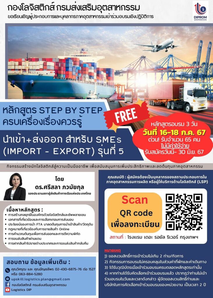 กรมส่งเสริมอุตสาหกรรม เปิดอบรมหลักสูตร Step by Step ครบเครื่องเรื่องควรรู้ นำเข้าส่งออก สำหรับ SMEs (Import-Export) รุ่น 5 วันที่ 16 – 18 กรกฏาคม 2567 เวลา 09.00 – 16.00 น. ณ โรงเเรม เดอะ รอยัล รีเวอร์ กรุงเทพ