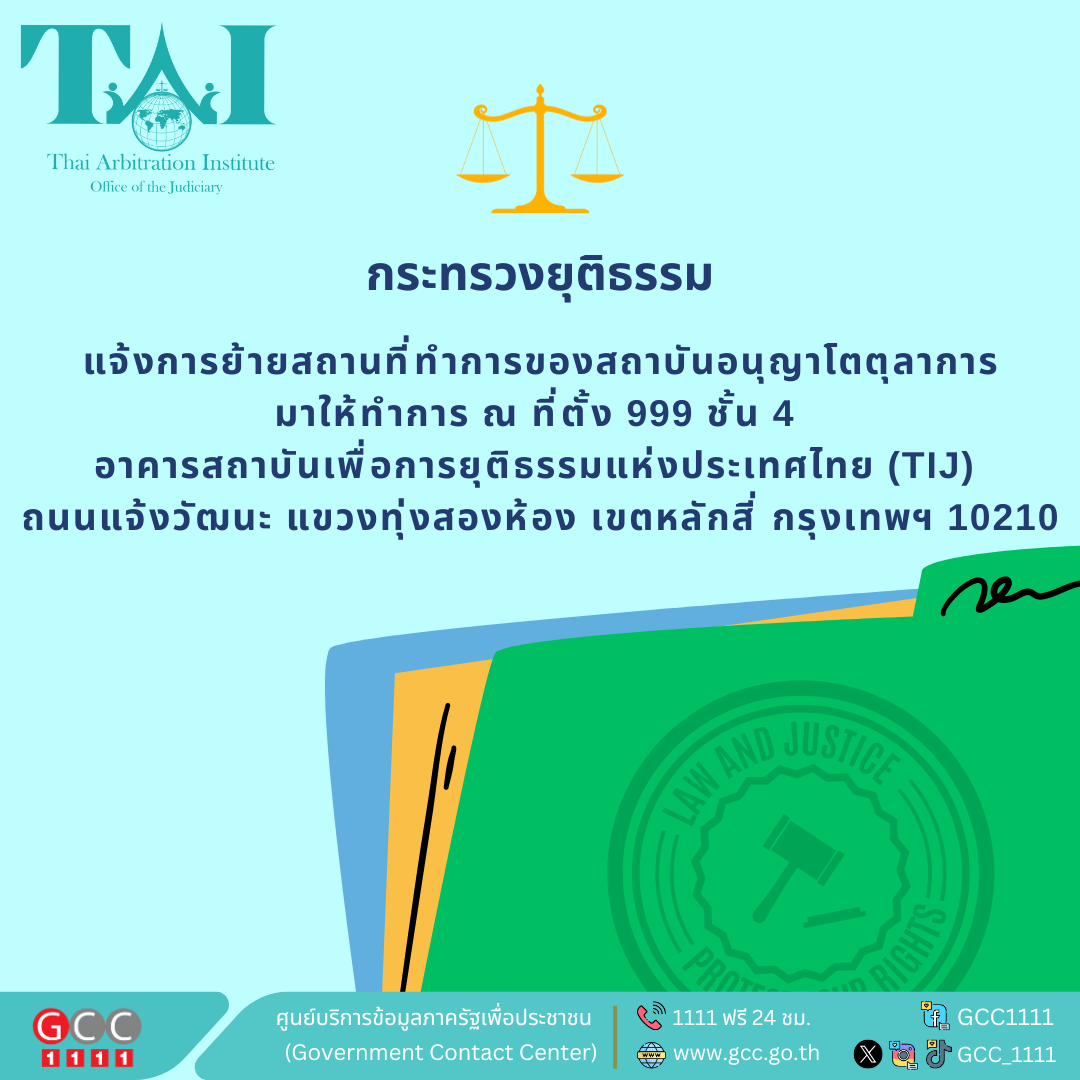 กระทรวงยุติธรรม แจ้งการย้ายสถานที่ทำการของสถาบันอนุญาโตตุลาการ มาให้ทำการ ณ ที่ตั้ง 999 ชั้น 4 อาคารสถาบันเพื่อการยุติธรรมแห่งประเทศไทย (TIJ) ถนนแจ้งวัฒนะ แขวงทุ่งสองห้อง เขตหลักสี่ กรุงเทพฯ 10210