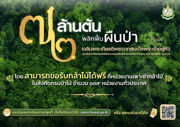กรมป่าไม้ เชิญร่วมปลูกต้มไม้ ในโครงการ “72 ล้านต้น พลิกฟื้น ผืนป่า” เฉลิมพระเกียรติพระบาทสมเด็จพระเจ้าอยู่หัว เนื่องในโอกาสพระราชพิธีมหามงคลเฉลิมพระชนมพรรษา 6 รอบ 28 กรกฎาคม 2567 โดยสามารถขอรับกล้าไม้ได้ฟรีที่หน่วยงานเพาะชำกล้าไม้ ในสังกัดกรมป่าไม้ จำนวน 139 หน่วยงาน ทั่วประเทศ และร่วมลงทะเบียนการปลูกที่ เว็ปไซต์กรมป่าไม้ : 72m.forest.go.th หรือ สแกนคิวอาร์โค้ด