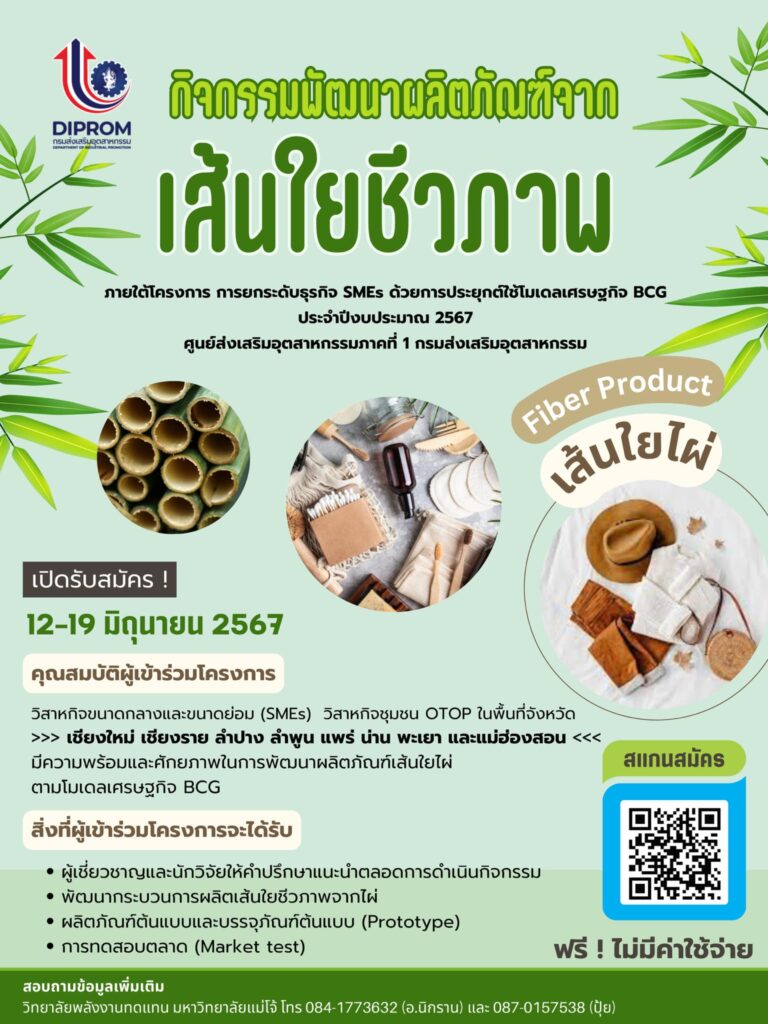 - กรมส่งเสริมอุตสาหกรรม เชิญชวน SMEs หรือวิสาหกิจชุมชน เข้าร่วม กิจกรรมพัฒนาผลิตภัณฑ์จากเส้นใยชีวภาพ