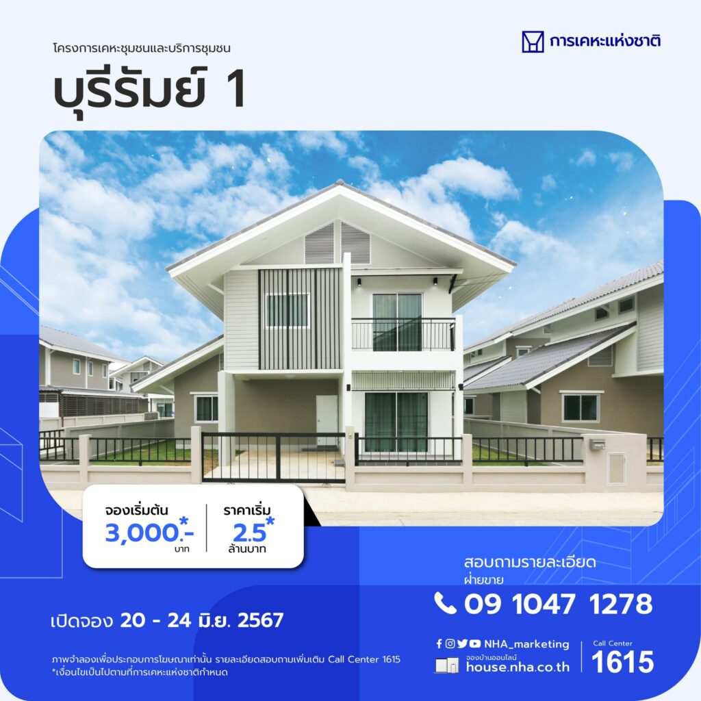 การเคหะแห่งชาติ เปิดจองโครงการเคหะชุมชนและบริการชุมชนบุรีรัมย์ 1 บ้านเดี่ยว 2 ชั้น เนื้อที่ประมาณ 50.5 ตร.ว. 3 ห้องนอน 2 ห้องน้ำจองเริ่มต้นเพียง 3,000 บาท *ระยะเวลาโปรโมชั่นถึง 30 กันยายน 2567