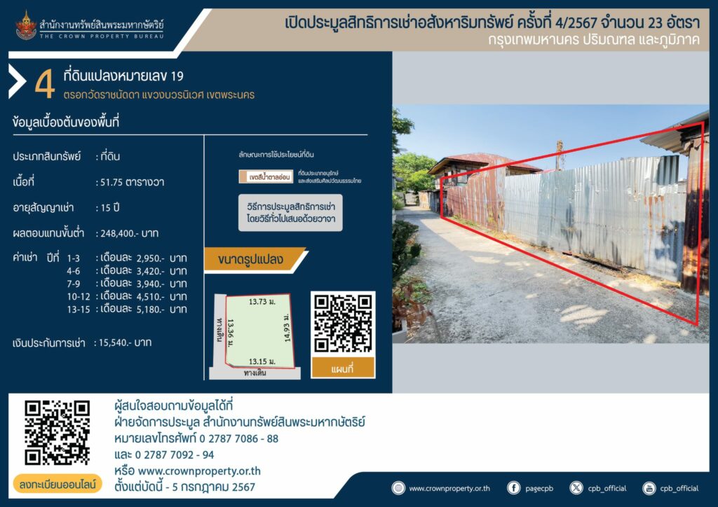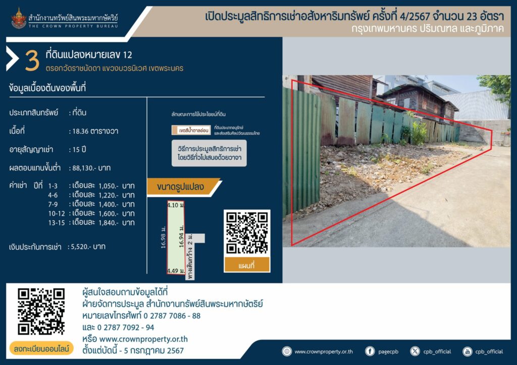 สำนักงานทรัพย์สินพระมหากษัตริย์ เปิดประมูลสิทธิการเช่าอสังหาริมทรัพย์ ที่ดินแปลงหมายเลข 12,19 เขตพระนคร