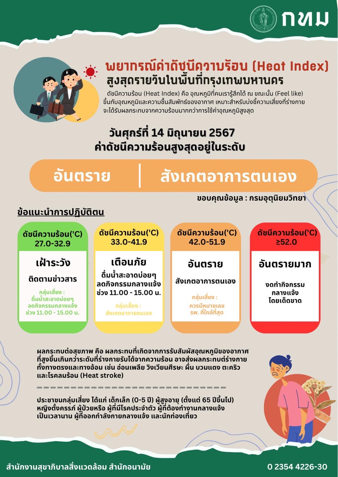 สำนักอนามัย กรุงเทพมหานคร แจ้งเตือนค่าดัชนีความร้อน (Heat Index) ประจำวันที่ 14 มิถุนายน 2567 ข่าวสารกิจกรรม สำนักอนามัย กรุงเทพมหานคร แจ้งเตือนค่าดัชนีความร้อน (Heat Index) ประจำวันที่ 14 มิถุนายน 2567 สำนักอนามัย กรุงเทพมหานคร แจ้งเตือนค่าดัชนีความร้อน (Heat Index) ประจำวันที่ 14 มิถุนายน 2567ค่าดัชนีความร้อน (Heat Index) อยู่ในเกณฑ์“อันตราย”คำแนะนำในการปฏิบัติตัวประชาชนทั่วไป : ควรลดระยะเวลาทำกิจกรรมกลางแจ้งกลุ่มเสี่ยง : จำกัดเวลาการทำกิจกรรมกลางแจ้ง (เวลา 11.00 – 15.00 น.) รวมทั้งสังเกตอาการตัวเอง หากมีอาการผิดปกติให้รีบพบแพทย์ ที่มา : https://bit.ly/4b8hGkp Post Views: 19 FacebookFacebookXTwitterLINELine
