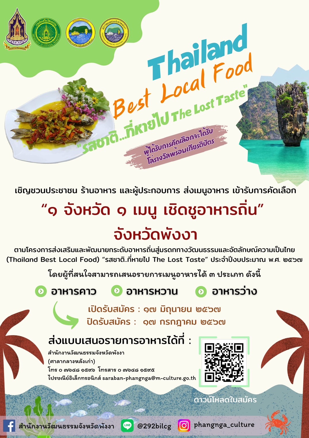 สำนักงานวัฒนธรรมจังหวัดพังงา เชิญชวนผู้ประกอบการร้านอาหารและผู้สนใจ ส่งเมนูอาหาร เพื่อเข้าร่วมการคัดเลือกเป็นเมนูอาหารถิ่นของจังหวัดพังงา “1 จังหวัด 1 เมนู เชิดชูอาหารถิ่น” ประจำปี 2567 ตามโครงการส่งเสริมและพัฒนายกระดับอาหารถิ่น สู่มรดกทางวัฒนธรรมและอัตลักษณ์ความเป็นไทย (Thailand Best Local Food) “รสชาติ…ที่หายไป The Lost Taste” ประจำปีงบประมาณ พ.ศ. 2567