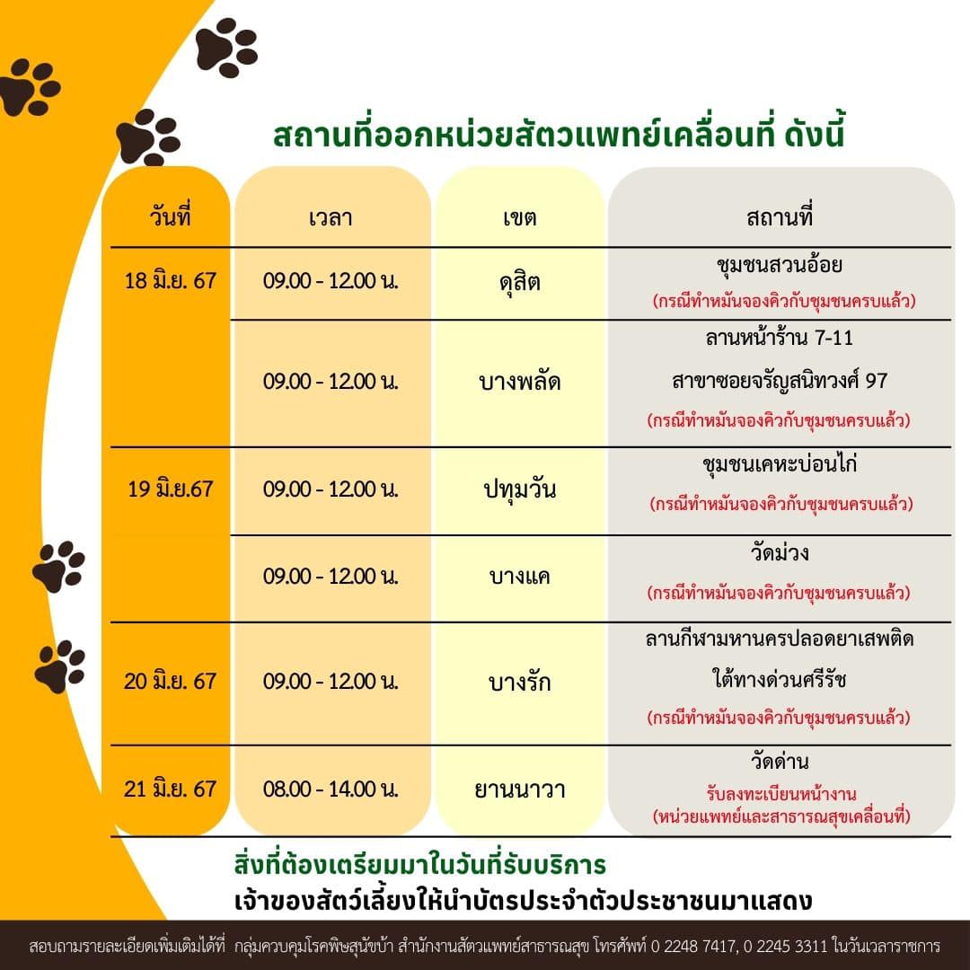 สำนักอนามัย ออกหน่วยแพทย์ฉีดวัคซีนป้องกันโรคพิษสุนัขบ้า ฉีดไมโครชิปและทำหมัน ในวันที่ 18 – 21 มิ.ย. 67