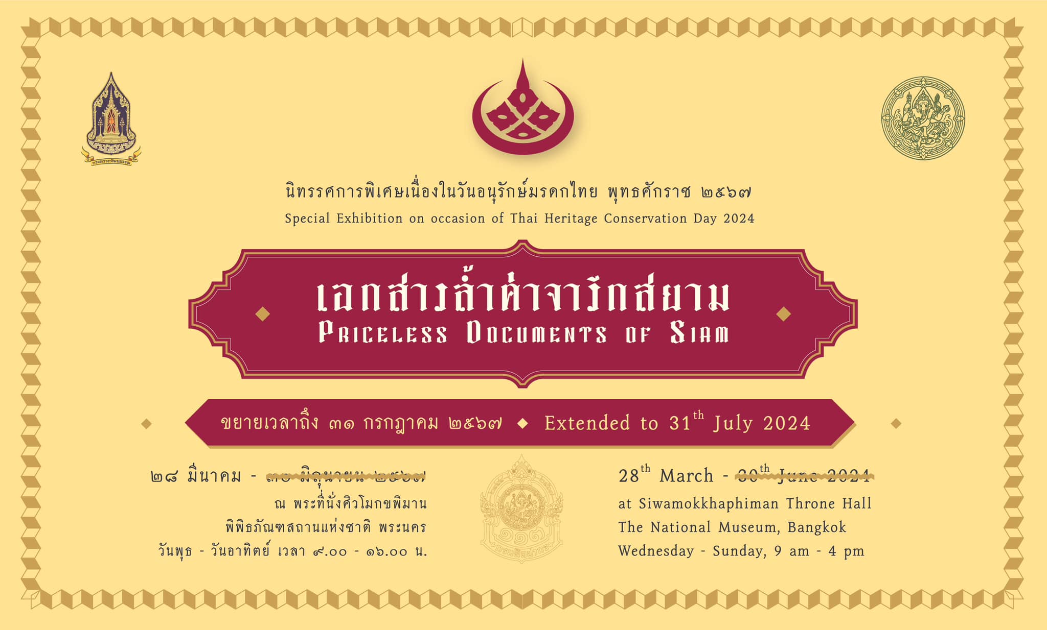 กรมศิลปากรขยายเวลาจัดนิทรรศการพิเศษเนื่องในวันอนุรักษ์มรดกไทย พุทธศักราช 2567 เรื่อง “เอกสารล้ำค่าจารึกสยาม” ถึงวันที่ 31 กรกฎาคม 2567 นิทรรศการเปิดให้เข้าชมทุกวันพุธ – วันอาทิตย์ เวลา 09.00 – 16.00 น. ณ พระที่นั่งศิวโมกขพิมาน พิพิธภัณฑสถานแห่งชาติ พระนคร