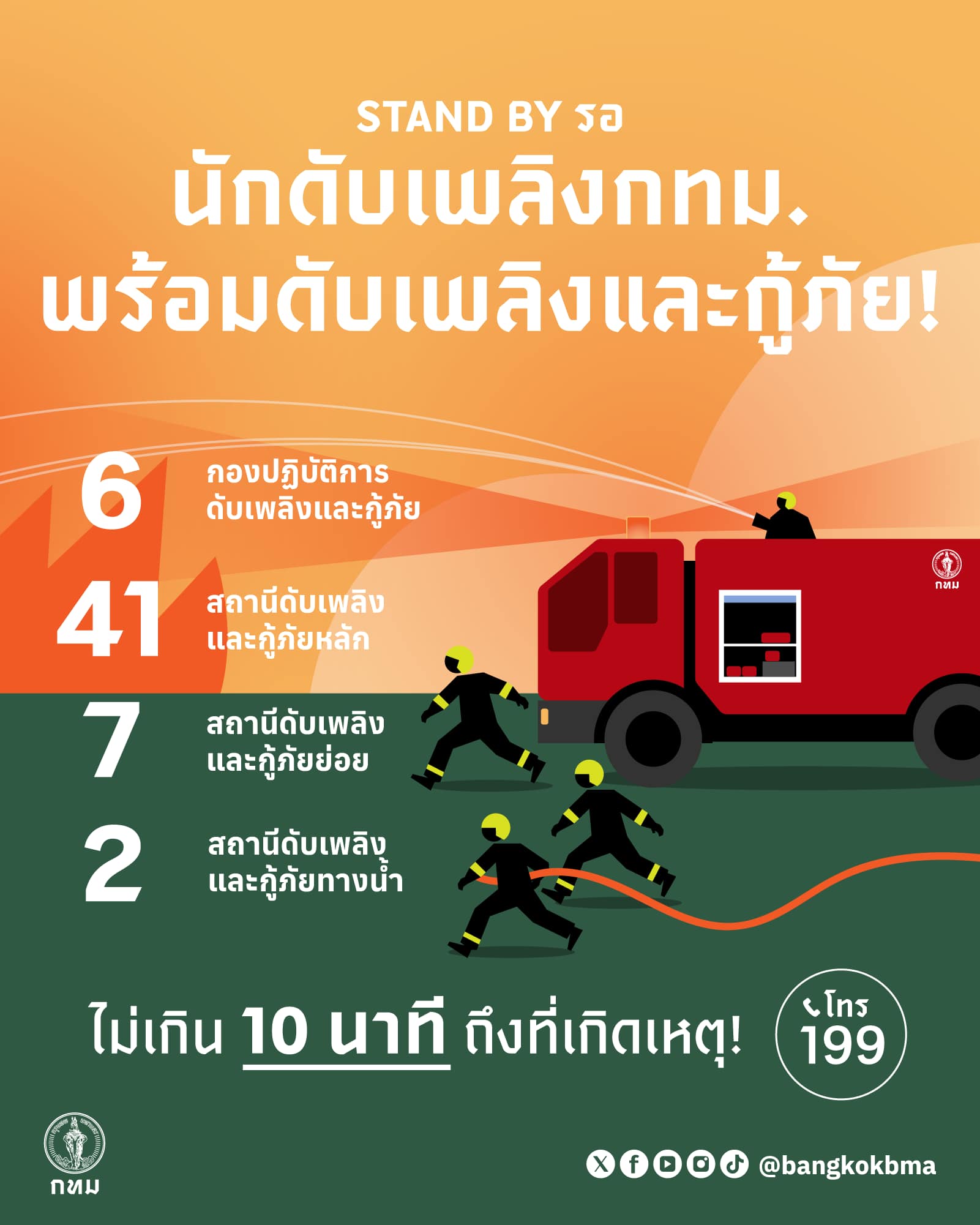 กรุงเทพมหานคร พร้อมดูแลความปลอดภัยของชาวกรุงเทพฯ ตลอด 24 ชั่วโมง ผ่านสายด่วน “199” ด้วยระบบการจัดการที่ทันสมัย ทำให้สามารถเข้าถึงพื้นที่เกิดเหตุได้อย่างรวดเร็วภายใน 10 นาที  ไม่ว่าจะอยู่จุดไหนของเมืองด้วยศักยภาพของ  6 กองปฏิบัติการดับเพลิงและกู้ภัย 41 สถานีดับเพลิงและกู้ภัยหลัก 7 สถานีดับเพลิงและกู้ภัยย่อย 2 สถานีดับเพลิงและกู้ภัยทางน้ำ