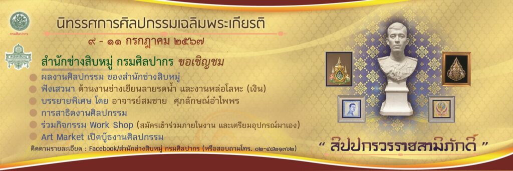 สำนักช่างสิบหมู่ กรมศิลปากร ขอเชิญชมนิทรรศการศิลปกรรมเฉลิมพระเกียรติ “สิปปกรวรราชสามิภักดิ์” ระหว่างวันที่ 9 – 11 กรกฎาคม 2567 เวลา 09.00 – 16.00 น. ณ สำนักช่างสิบหมู่ ศาลายา จังหวัดนครปฐม