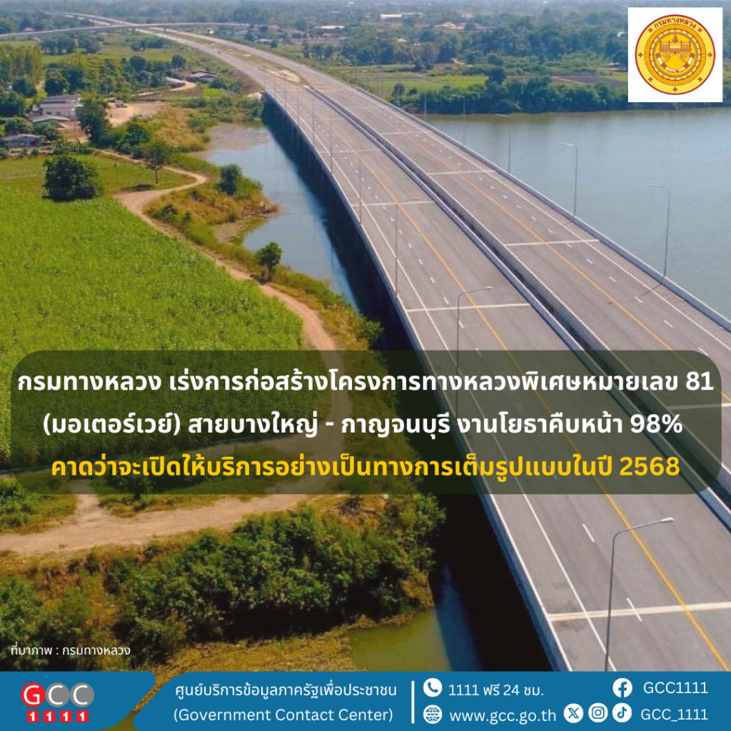 กรมทางหลวง เร่งรัดการก่อสร้างมอเตอร์เวย์หมายเลข 81 สายบางใหญ่ – กาญจนบุรี งานโยธาก่อสร้างแล้วเสร็จ 20 สัญญา จากทั้งหมด 25 สัญญา คิดเป็น 98.52% คาดว่าจะเปิดให้บริการอย่างเป็นทางการเต็มรูปแบบในปี 2568