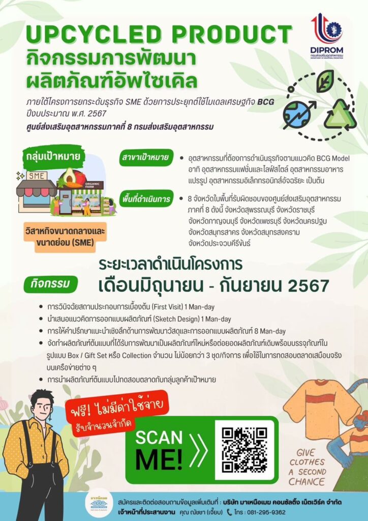 กรมส่งเสริมอุตสาหกรรม โดย ศูนย์ส่งเสริมอุตสาหกรรมภาคที่ 8 ขอเชิญผู้ประกอบการในพื้นที่จังหวัดสุพรรณบุรี ราชบุรี กาญจนบุรี เพชรบุรี นครปฐม สมุทรสาคร สมุทรสงคราม และประจวบคีรีขันธ์ เข้าร่วมกิจกรรมการพัฒนา ผลิตภัณฑ์อัพไซเคิล (Upcycled Product) ภายใต้โครงการยกระดับธุรกิจ SME ด้วยการประยุกต์ใช้โมเดลเศรษฐกิจ BCG ประจำปี 2567 ระยะเวลาดำเนินการ มิถุนายน – กันยายน 2567 ฟรี ไม่มีค่าใช้จ่าย สมัครได้ที่ https://forms.gle/BAJmFnc9HfeD49y68 สอบถามเพิ่มเติมที่ คุณณัชชา (เจี๊ยบ) 081 295 9362