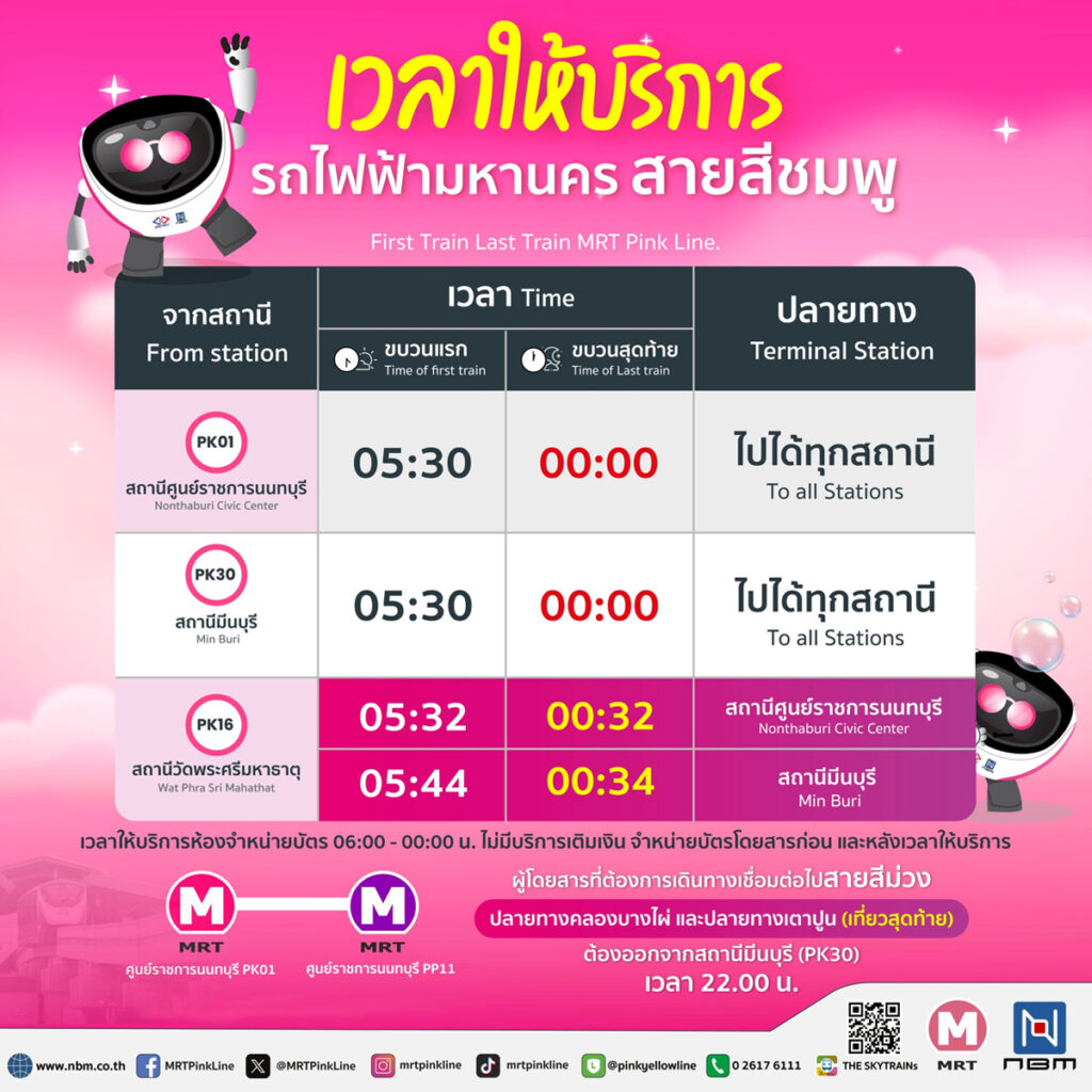รถไฟฟ้ามหานคร สายสีชมพู แจ้งเวลาให้บริการรถไฟฟ้ามหานคร สายสีชมพู พร้อมกับขบวนรถเที่ยวแรก และเที่ยวสุดท้าย