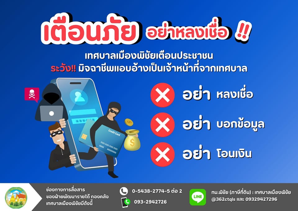 เทศบาลเมืองพิชัย แจ้งเตือนประชาชน ระวัง มิจฉาชีพแอบอ้างเป็นเจ้าหน้าที่จากเทศบาลอย่าหลงเชื่อ อย่าบอกข้อมูลส่วนตัว อย่าโอนเงิน