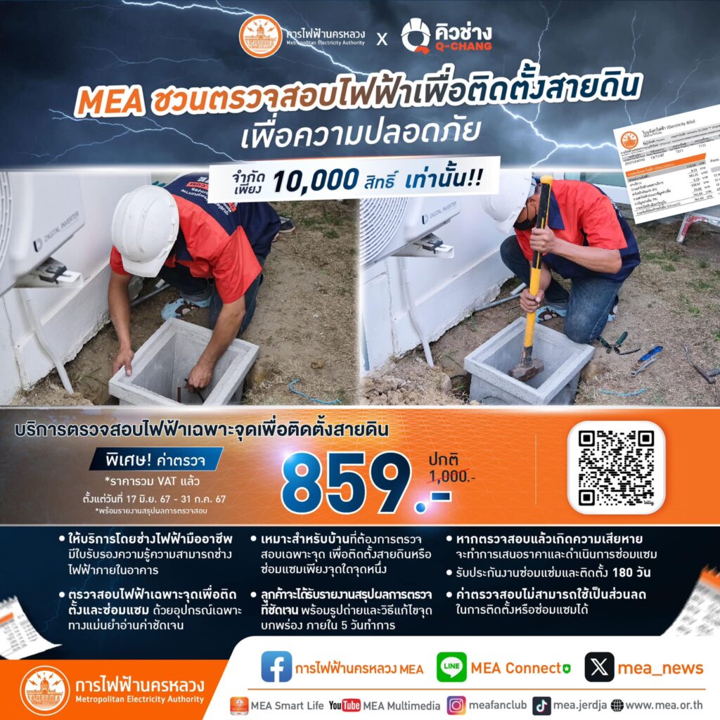MEA แจ้งผู้ใช้ไฟฟ้า ลงทะเบียนรับโค้ดส่วนลดการตรวจสอบระบบไฟฟ้าเฉพาะจุดเพื่อติดตั้งสายดิน