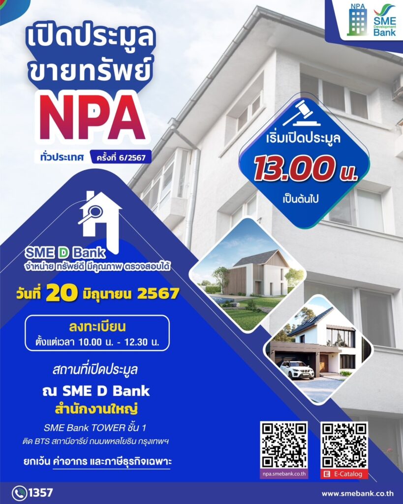ธนาคารพัฒนาวิสาหกิจขนาดกลางและขนาดย่อมแห่งประเทศไทย จัดงานประมูลขายทรัพย์ NPA ทั่วประเทศ ครั้งที่ 6/2567 วันพฤหัสบดีที่ 20 มิถุนายน 2567 ลงทะเบียนตั้งแต่เวลา 10.00 – 12.30 น. เริ่มประมูลเวลา 13.00 น. เป็นต้นไป ณ SME D Bank ณ สำนักงานใหญ่